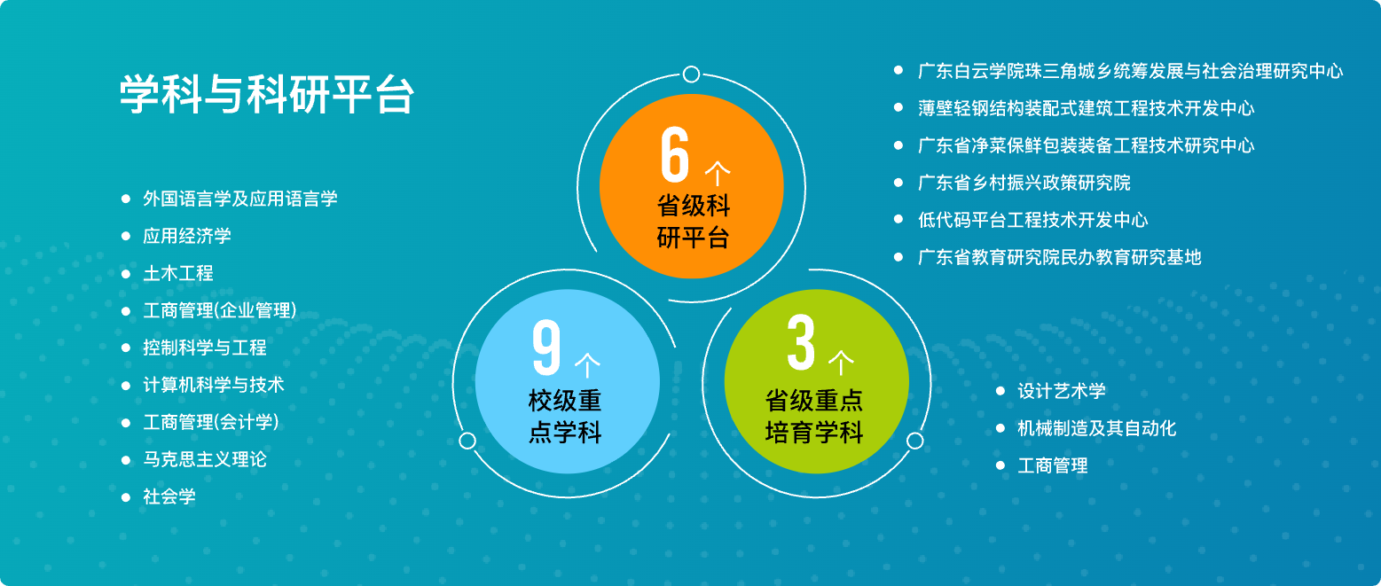 学科建设硕果累累,科研能力不断提升。建有3个省级重点培育学科(设计艺术学、机械制造及其自动化、工商管理)和9个校级重点学科,形成了较为完备的应用学科建设体系。为支撑重点学科发展,学校成功获批了6个省级科研平台(beat365手机版官方网站珠三角城乡统筹发展与社会治理研究中心、薄壁轻钢结构装配式建筑工程技术开发中心、广东省净菜保鲜包装装备工程技术研究中心、广东省乡村振兴政策研究院、低代码平台工程技术开发中心、广东省教育研究院民办教育研究基地)和9个校级科研平台。2024年,学校牵手同济大学共同建设广州轻钢集成建筑研究院,为学校的发展铸就了一座崭新的里程碑。